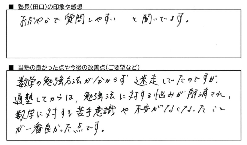 数学の勉強方法が分からず迷走していたのですが、通塾してからは、勉強法に対する悩みが解消され、数学に対する苦手意識や不安がなくなったことが一番良かった点です。